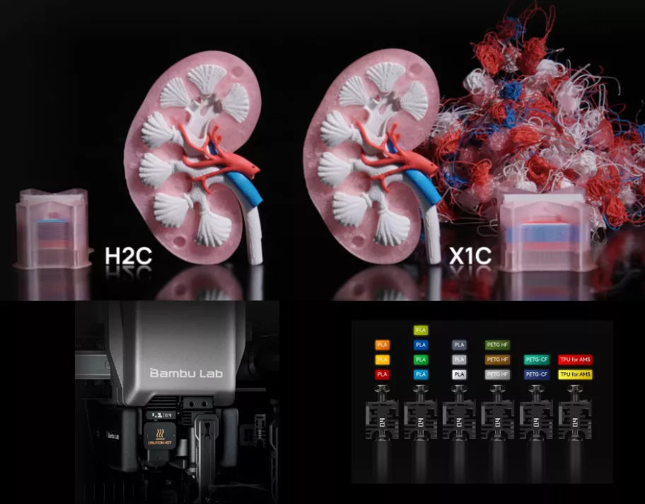 Combine rigid, flexible, and engineering materials within a single print. From TPU joints to fiber-reinforced structures, the H2C enables functional, assembled-ready parts without manual intervention.