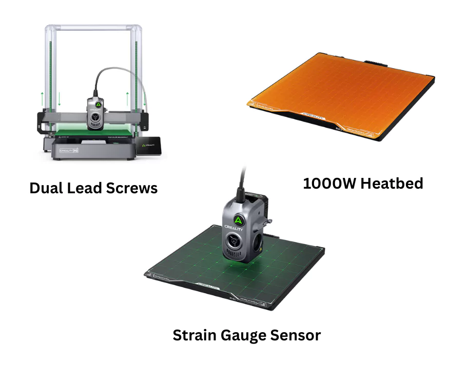 Dual lead screws adjust the X-axis precisely using lead screws. The strain gauge sensor auto-probes the bed to generate an accurate leveling mesh. The 1000W AC Heatbed reaches 60°C in just 30 seconds or 100°C in 90 seconds for faster print prep.
