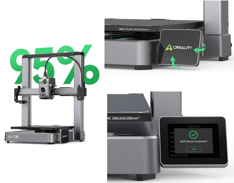 The Hi Combo comes 95% pre-assembled, requiring only a few screws and some wiring. Combined with a detailed boot-up guide, even first-time users can go from unboxing to printing in under 10 minutes. Features 8-minute setup with only 7 screws, foldable 3.2" touchscreen, and solid wiring connections.